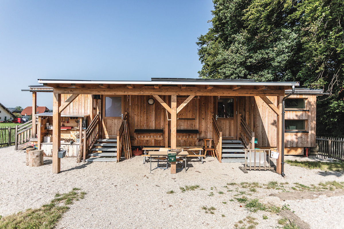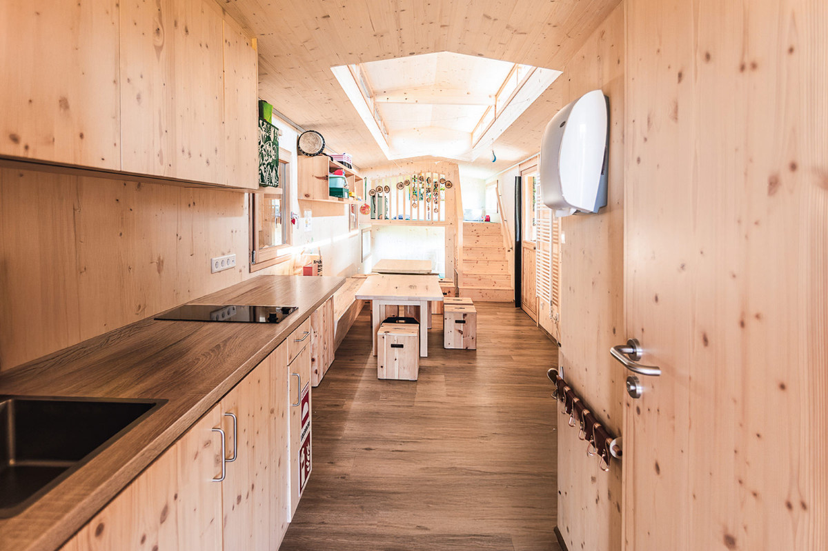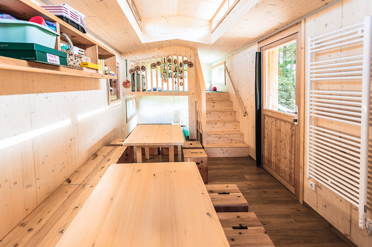 Im Inneren des Wichtelhauses gibt’s eine Empore, hölzerne Garderoben und jede Menge Spiel- und Stauraum. Dazu kommen Tische, Bänke, Hocker und Regale aus Zirbenholz. Und eine Fußbodenheizung hält kleine Füße warm.